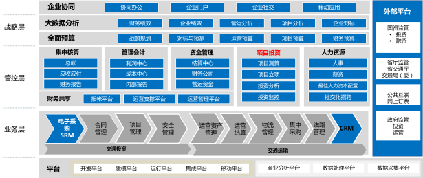 在集团管控层面,主要实现对整个交通企业集团人、财、物各个方面全方位的管理,除了传统的集中财务管理、集团资金管理、人力资本管理、集团资产管理等,系统还支持共享服务模式的应用,以流动性管理为核心的营运资金管理、助力企业内部精细化管理的管理会计应用、基于大数据和社交化招聘的最佳人力资本配置等。