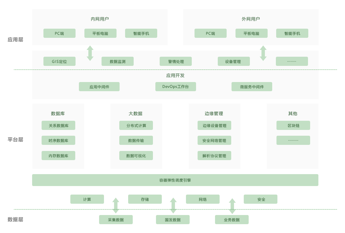 数据层:主要负责整个系统的数据采集以及存储,主要来源为现场设备采集 数据、国家发布数据、业务往来的数据等,为平台和应用形成强大的数据支撑 平台层:平台层分为IaaS层和PaaS层。IaaS层对外给予标准的符合OpenStack规范要求的REST API。对内在功能性、可靠性、安全性、支撑工具等方面全面优化开源 OpenStack,全面接入OpenStack各领域核心组件,给予完善的云基础设施服务能力,涵盖计算、存储、网络、安全等 IaaS服务,根据客户需求能够支持公有云、私有云和混合云三种不同应用模式。PaaS层:给予云计算、大数据、应用开发、中间件、人工智能、区块链等基础PaaS服务能力。顺利获得Ebpay企业大脑产品,面向各个行业和领域,给予以数据为核心的工业数据服务、机理模型服务和业务微服务,此外还给予了面向工业设备连接的物联网服务、云化软件和APP开发服务及基于区块链技术构建的云资源管理库 应用层:顺利获得平台的搭建,主要面向石油、化工、冶金等不同行业的不同业务流程,给予GIS定位、数据监测、警情处理、设备管理等相关的应用,为相关人员随时随地关注安全状况和污染情况,对企业全方面的有效管理