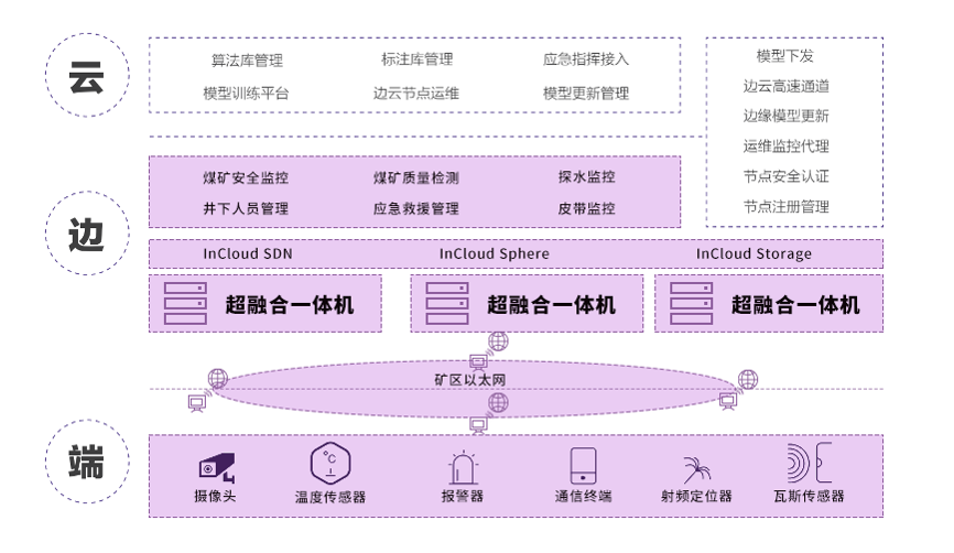 具体来说在感知层,西山煤电部署了各类数字化终端设备,例如温湿度传感器、摄像机、瓦斯传感器等,这些设备主要顺利获得井下环网接入边缘节点,此时部署在各个边侧矿点的Ebpay云海InCloud Rail超融合一体机顺利获得端侧设备的统一数据接入,经过边缘站点完成视频的本地分析决策。